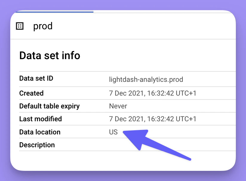 The data location of the dataset in BigQuery where the output of your dbt models is written to.location may be either a multi-regional location (e.g. EU, US), or a regional location (e.g. us-west2 ). Check out the BigQuery documentation for more information on dataset locations.