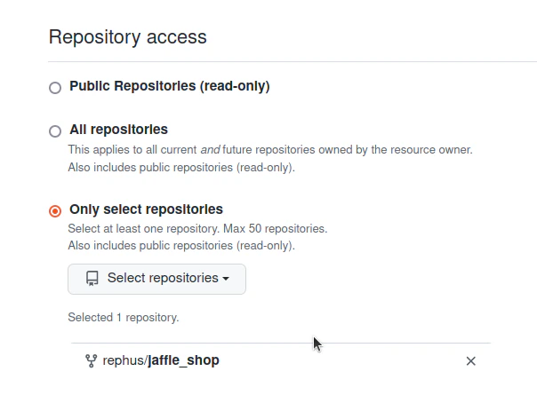 Fine-grained access tokens are new special tokens that can only give access to individual repositories on your github account. You can read more about it on the Github docs.- Go to Settings > Developer access > Personal access tokens > Fine-grained token