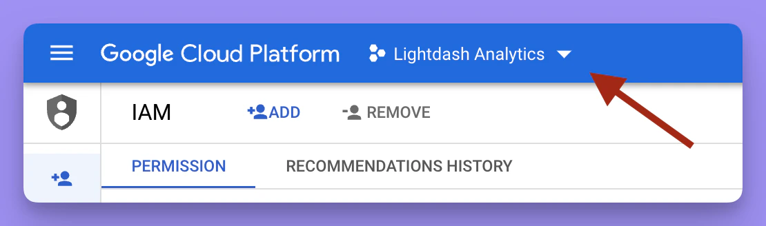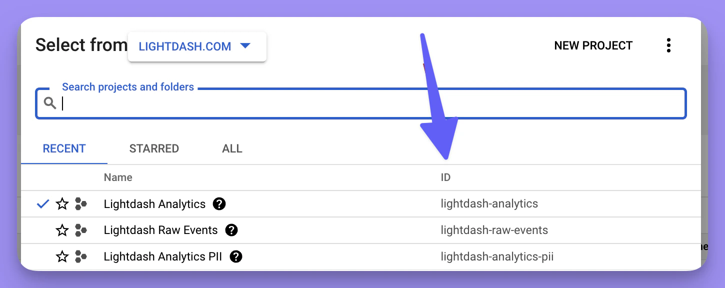 This is project ID from Google Cloud Platform for the data that you want to connect Lightdash to. To find your project ID, head to the BigQuery Cloud console. Once you’re in there, click on the project name in the top bar.