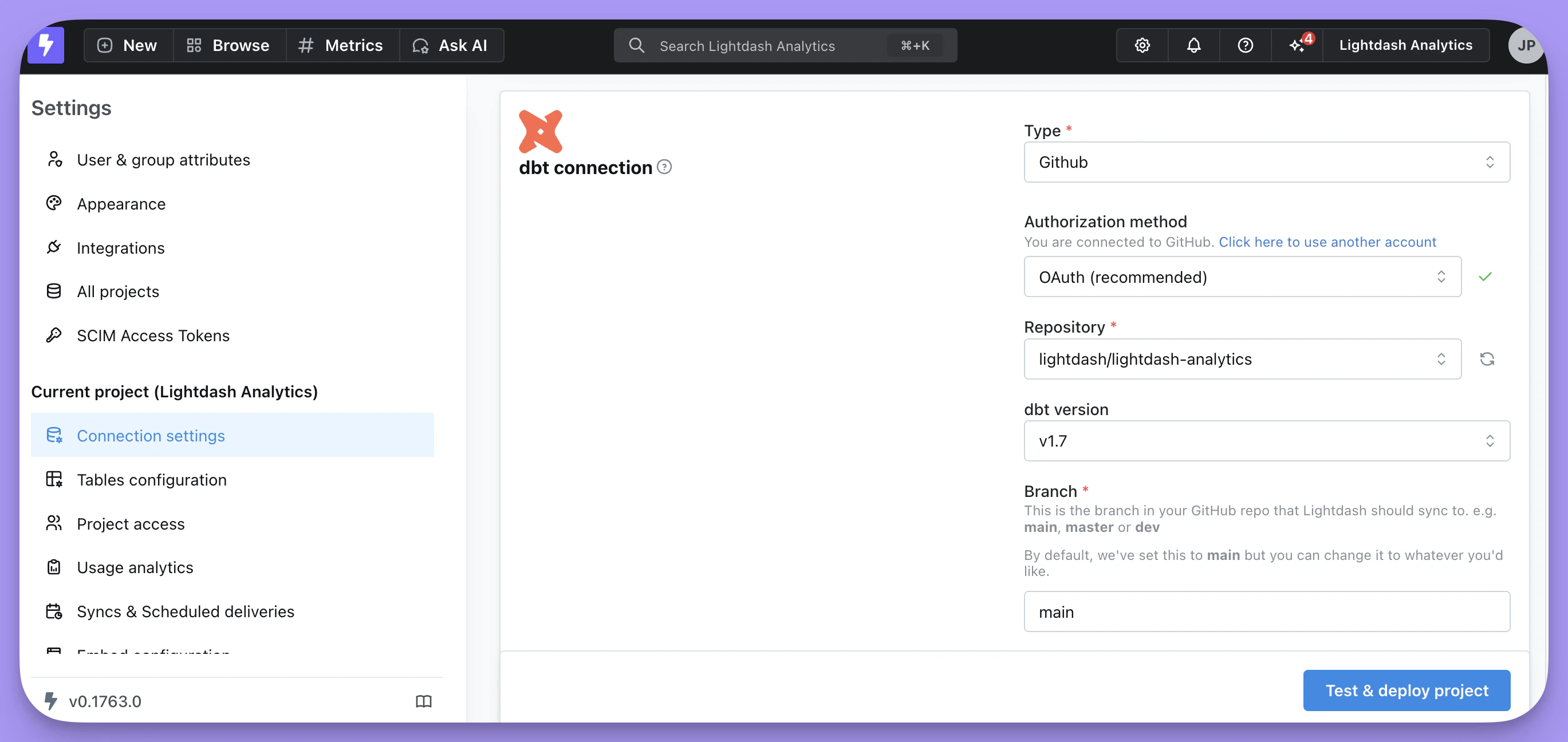 This is the branch in your GitHub repo that Lightdash should sync to. e.g.main, master or dev