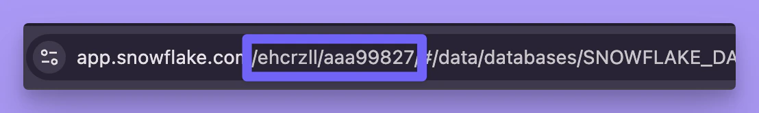 For example, if your Snowflake URL looks like https://app.snowflake.com/ehcrzll/aaa99827/#/homepage, your account identifier would be ehcrzll-aaa99827 (combining both IDs with a hyphen).