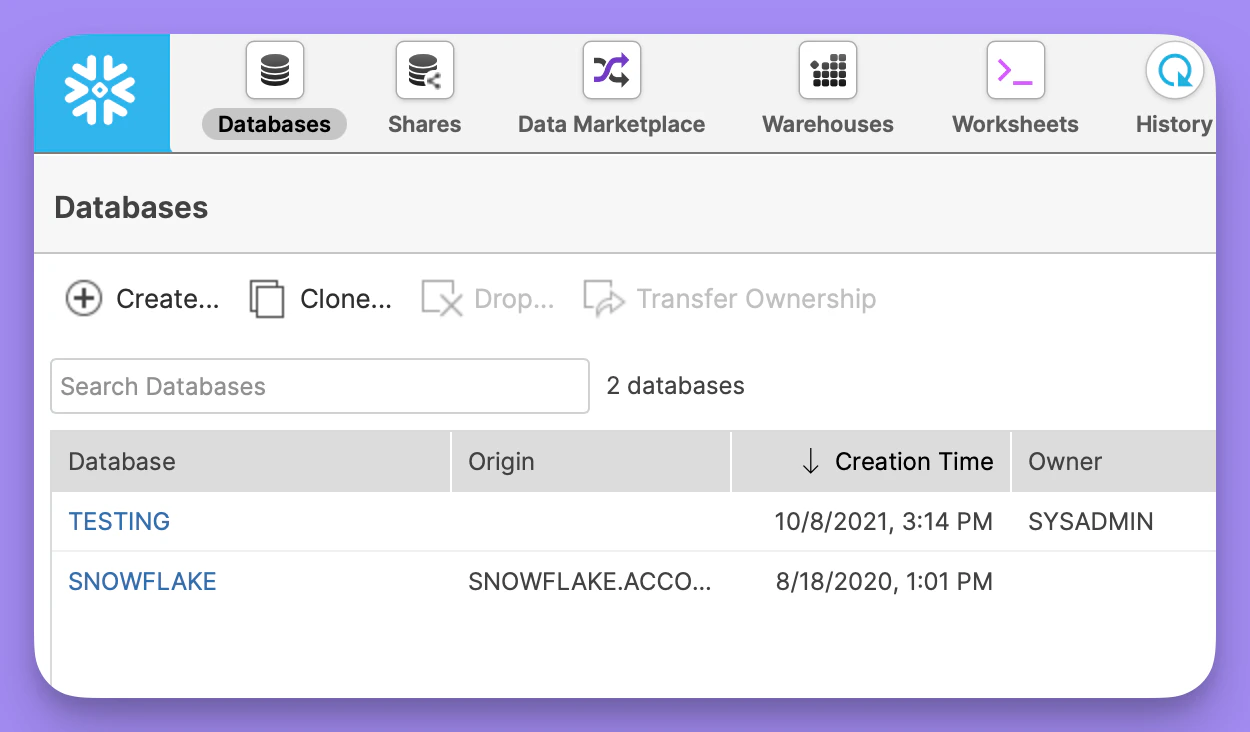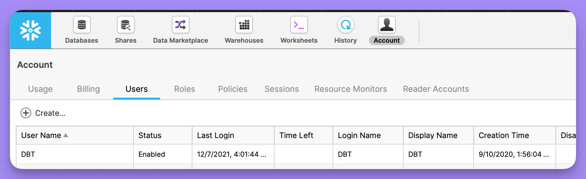 This is the login name for your Snowflake user. This is usually the same username you use to login to Snowflake. Alternatively, you can create a new user through the snowflake consolewith a username and password specifically for Lightdash to use. If you’re a snowflake admin you can list all users available in the snowflake console: