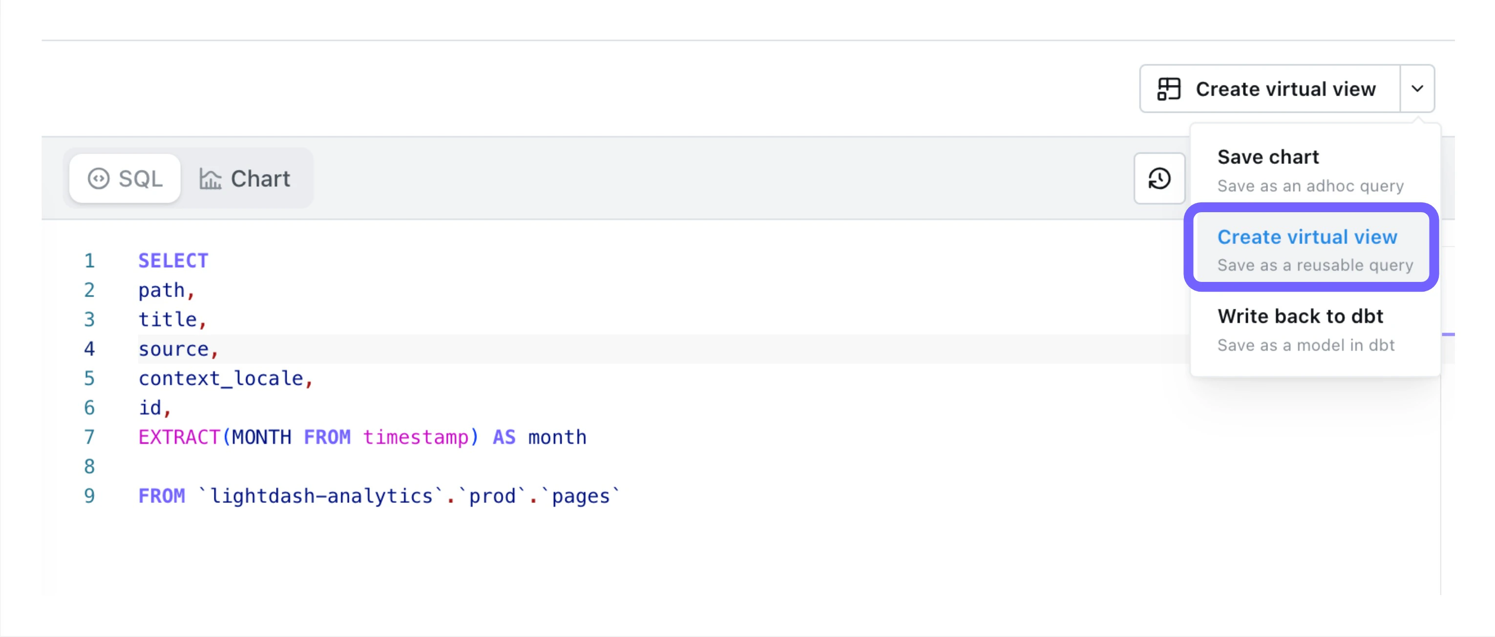 To create a Virtual View from the SQL Runner, select theCreate Virtual View option from the save drop-down.