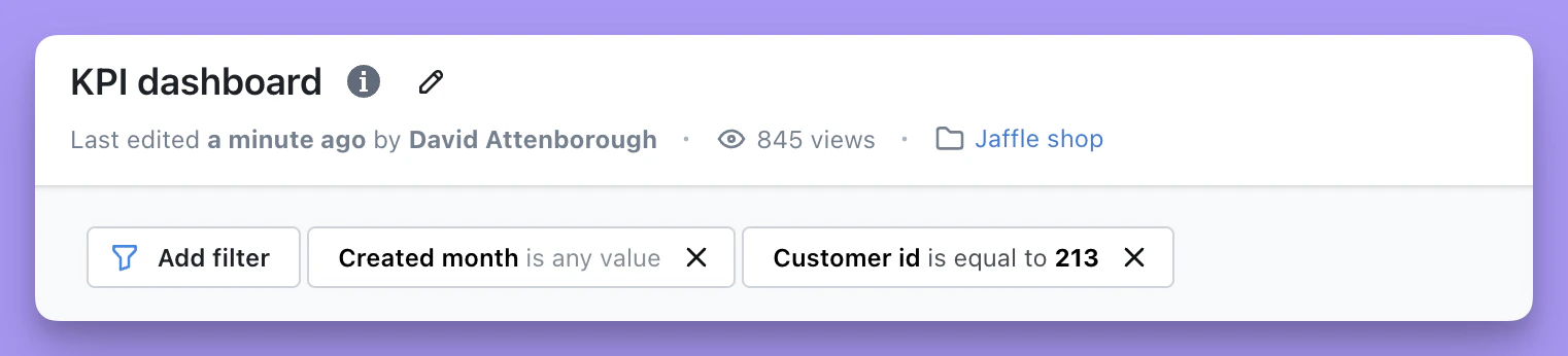 Add filters button on a dashboard. Head to edit mode and toggle the eye icon next to the Add filters dropdown to hide or show it. When hidden, end users are restricted to only using filters that have been specifically set up in dashboard edit mode.Adding temporary filters using the add filters button