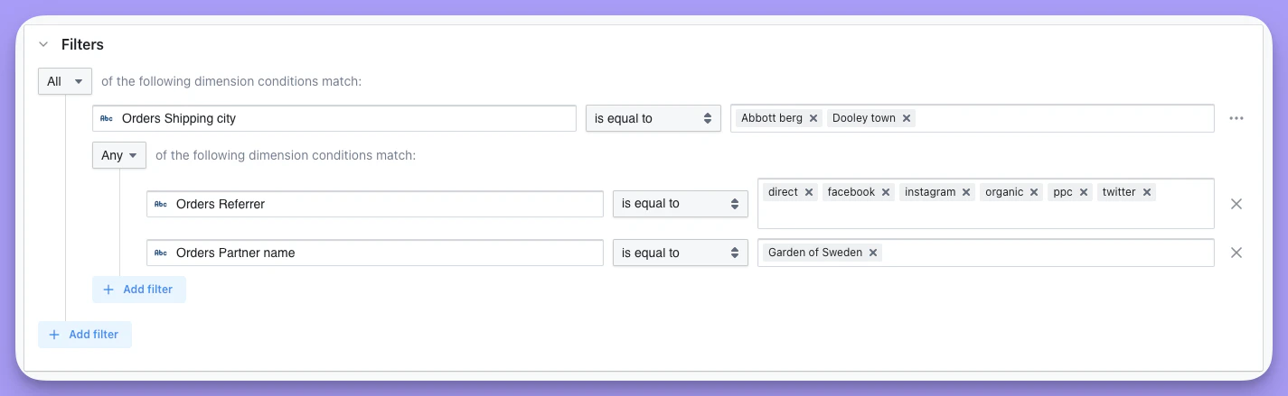 Here are some general tips about filters that apply to using them in both the Explore view and in dashboards.If you want to have multiple filters, just click + Add filter